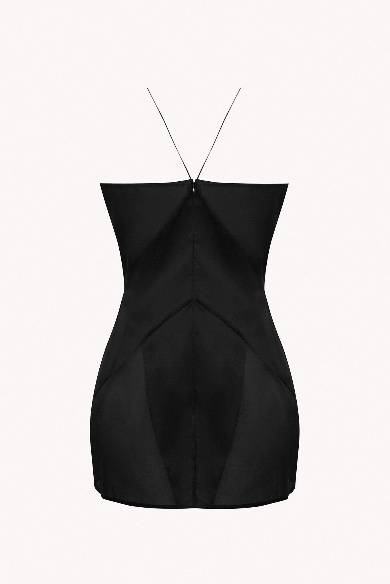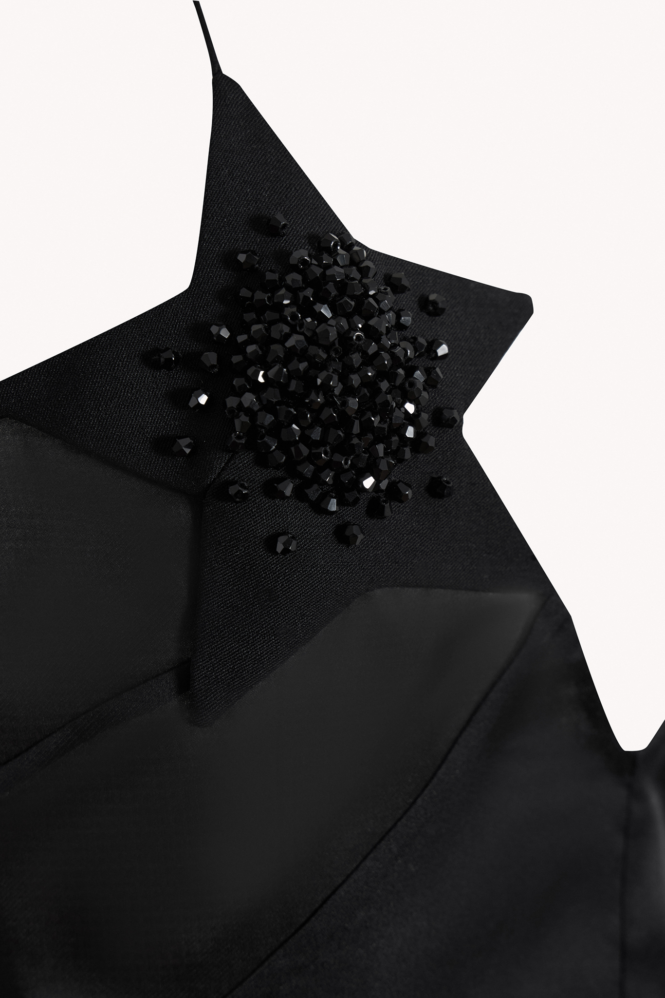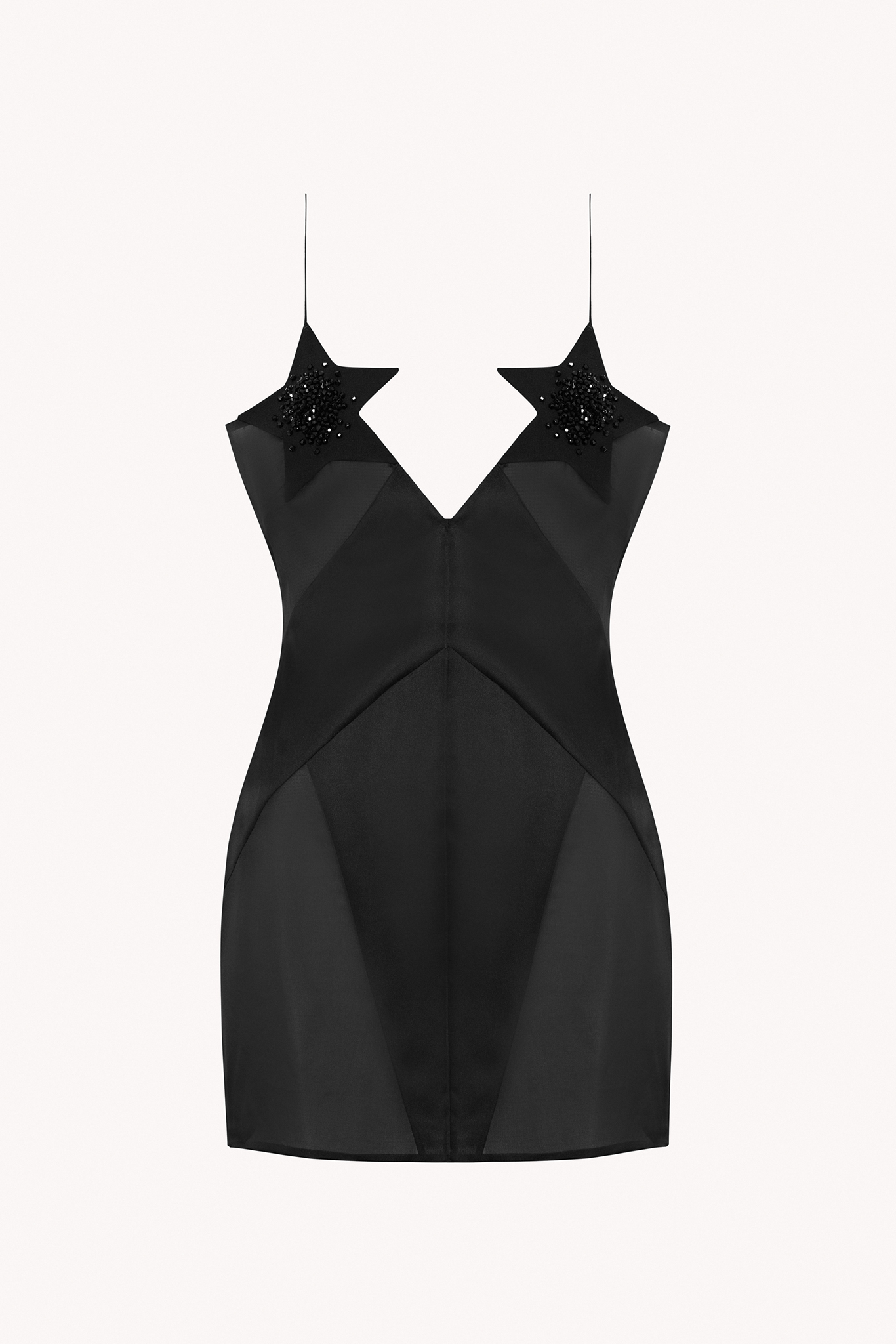 Mini dress crafted from sheer black silk organza, featuring two front star – shaped appliques hand – embellished with black crystals. Thin straps and a fitted silhouette enhance the body shape.
