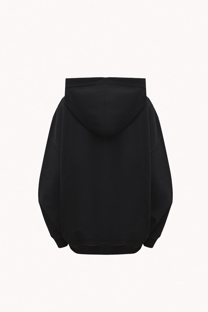 An oversized hooded sweatshirt in matt black – minimalist yet bold. Made from premium soft- touch cotton blend , it reflects the effortless essence of EPUZER’S rock glam. Subtle black -on- black logo adds a a refined, luxurious touch. Everyday comfort. Distinctive energy.