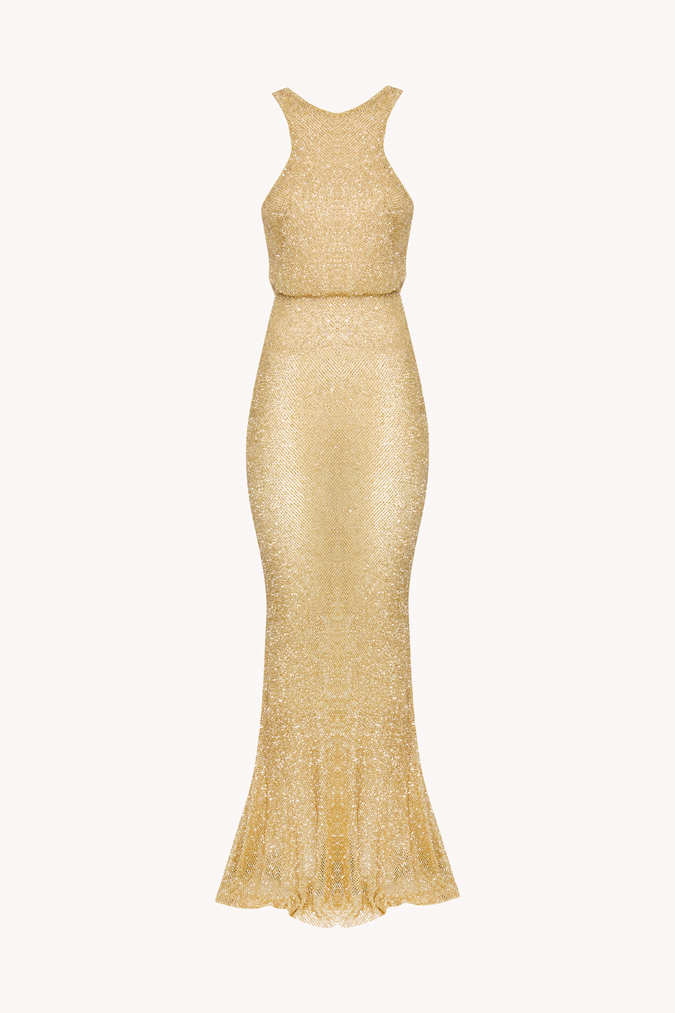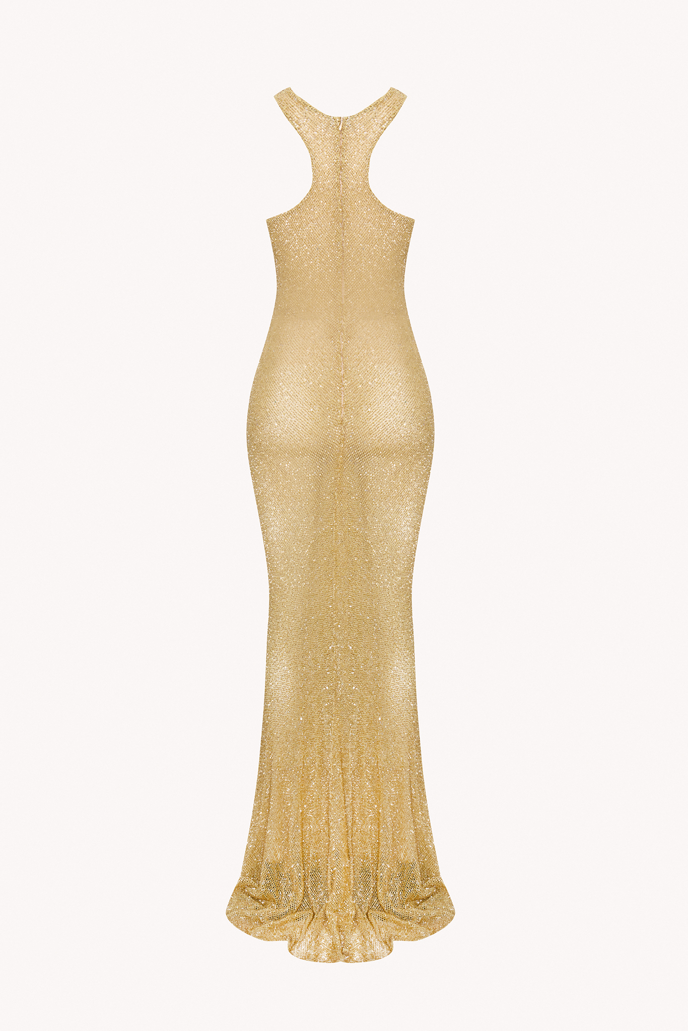 Handcrafted evening gown dress made from crystal- embellished fabric in a golden starlight tone. The fitted silhouette enhances the waist, softly flaring towards to hem. Racerback cut at the back reveals the shoulders, adding a modern lightness. A luminous, sensual couture statement.
