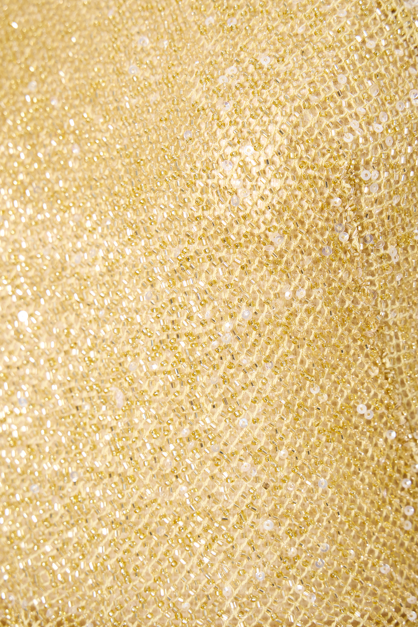 Ręcznie szyta suknia wieczorowa z luksusowej złotej siatki, ozdobiona złotymi koralikami. Dopasowana sylwetka podkreśla talię rozszerzająca się ku dołowi. Tył z wycięciem typu bokserka eksponuje plecy i nadaje nowoczesnej lekkości.