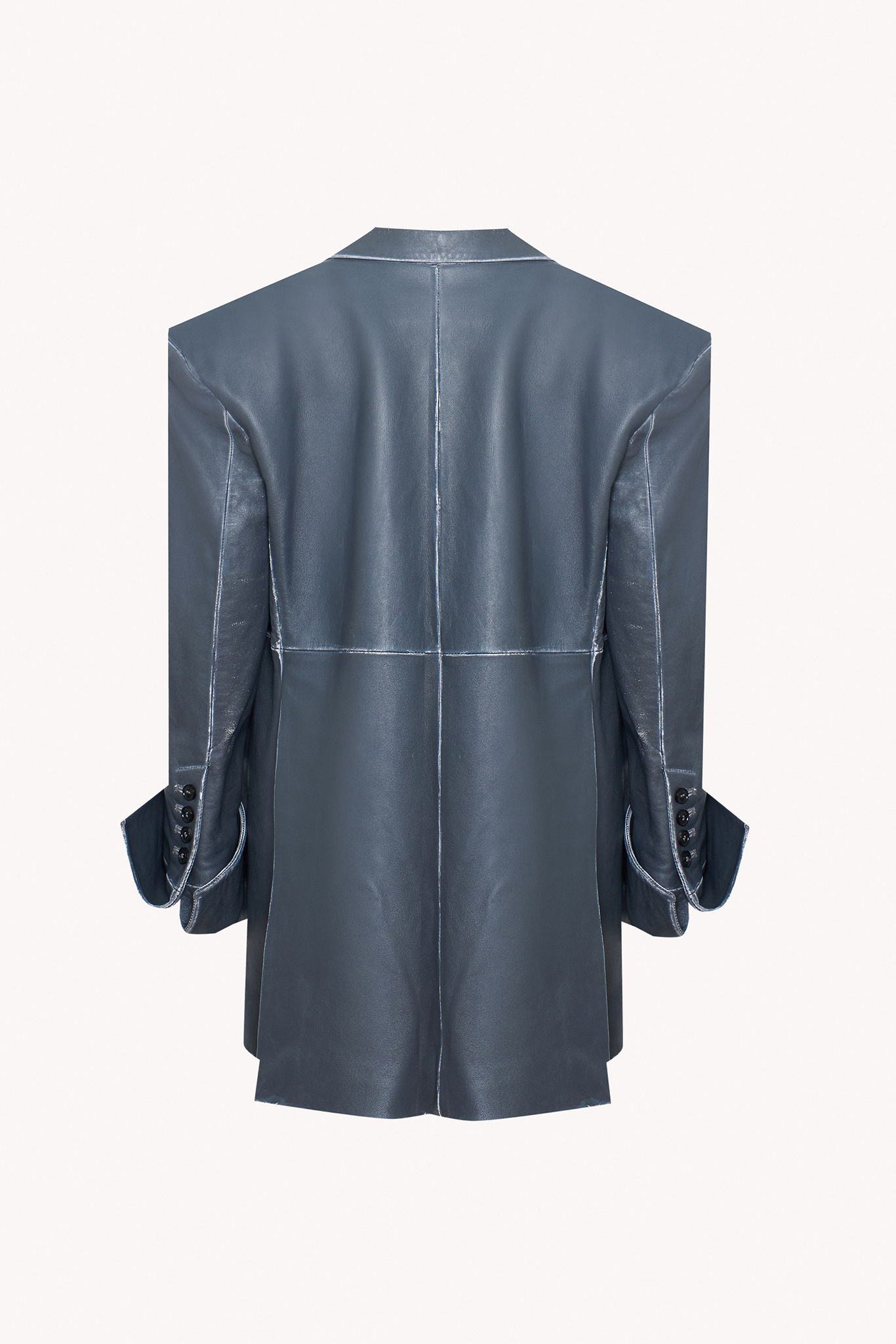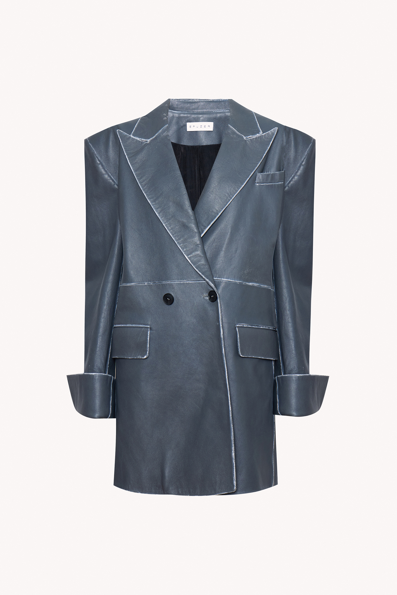 Long oversized blazer crafted from grey leather with vintage finish. Broad padded shoulders, double-breasted design with wide laples. Features two side slits at the back for ease of movement and fashion- forward look.