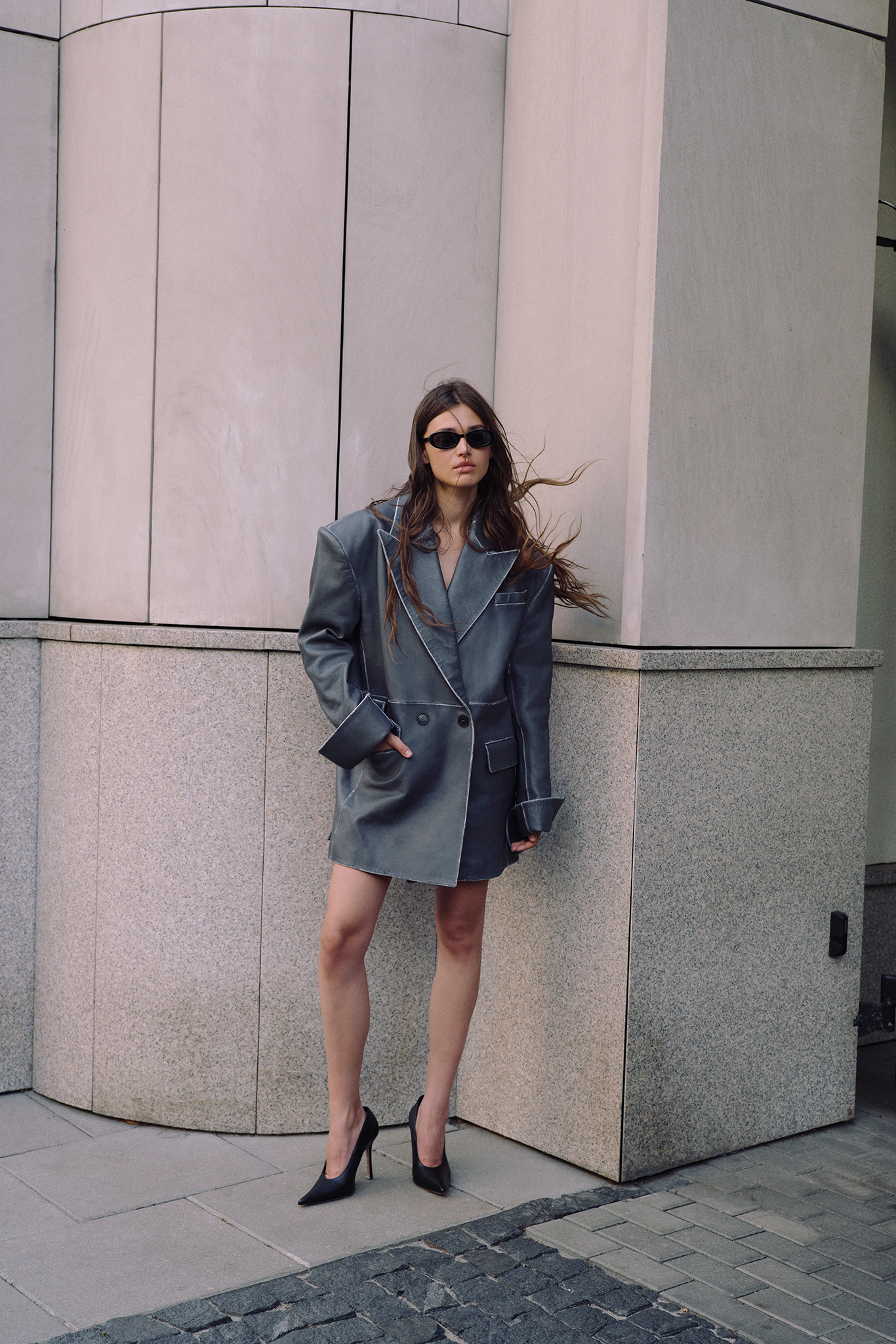 Długa marynarka oversize wykonana ze skóry w szarym kolorze w efekcie vintage. Szerokie ramiona na poduszkach, dwurzędowy fason z szerokimi klapami. Z tyłu dwa boczne pęknięcia nadające swobody ruchu i modowego charakteru.