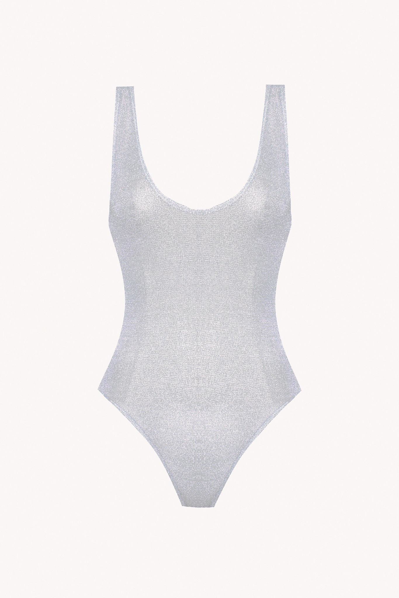 Body z metalicznej siateczki w kolorze srebrnym z głębokim dekoltem z przodu i mocno wyciętymi plecami. Zapięcie z tyłu na metaliczną klamrę. Skompletuj swój look z metalicznymi legginsami w kolorze srebrnym.