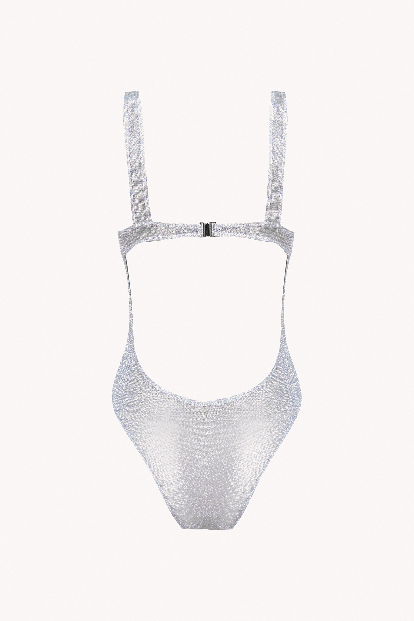 Bodysuit im metallic silver mesh, featuring a deep front neckline and an open back with a metallic clasp closure. Complete your look with Metallic mesh leggings silver.
