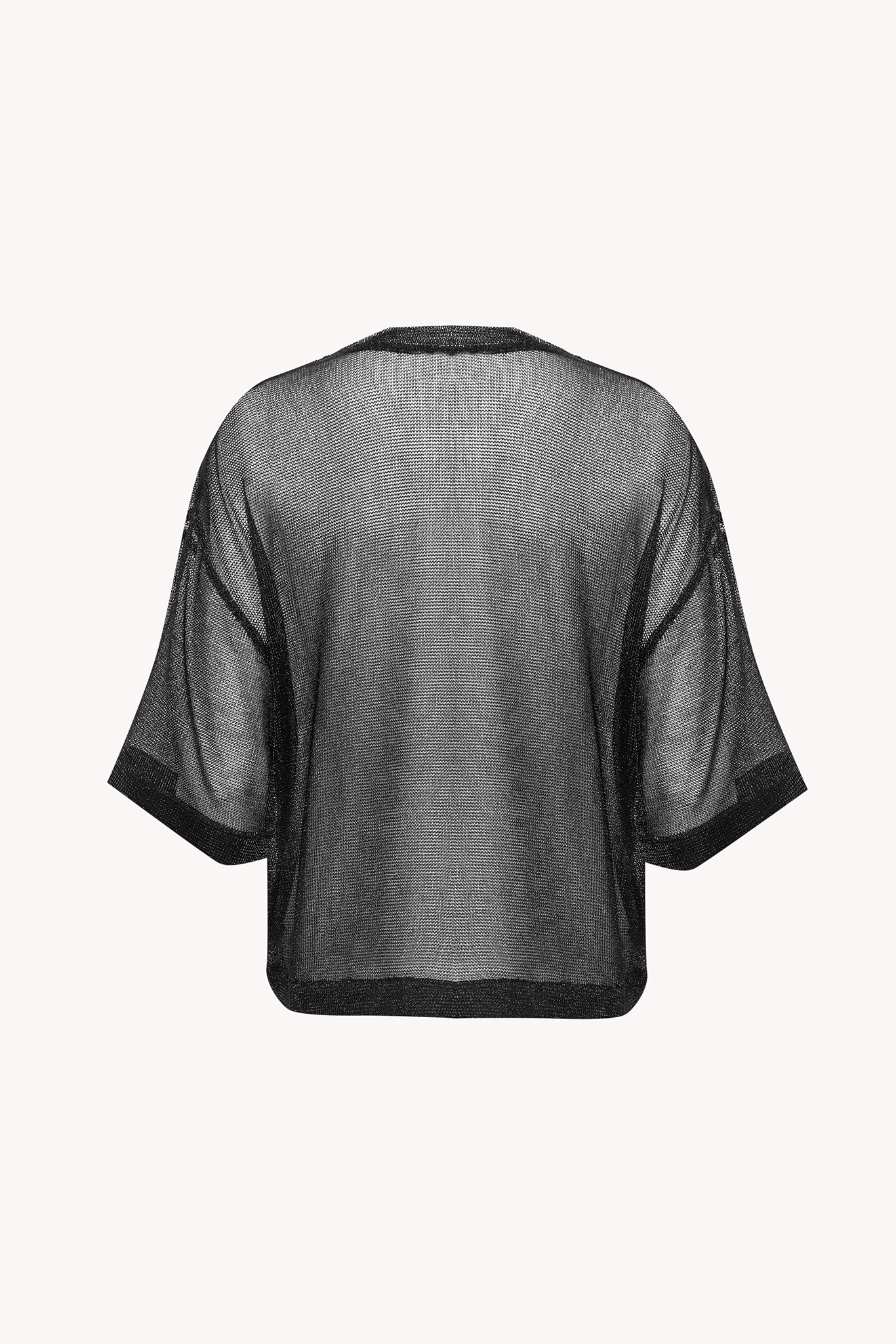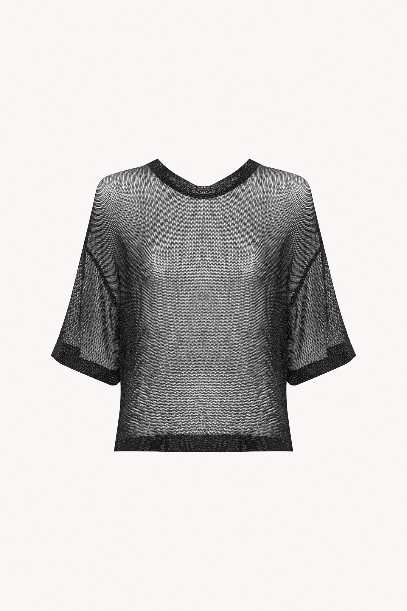 T-shirt in transparent metallic black mesh made from viscose yarn. Loose fit with short sleeves.