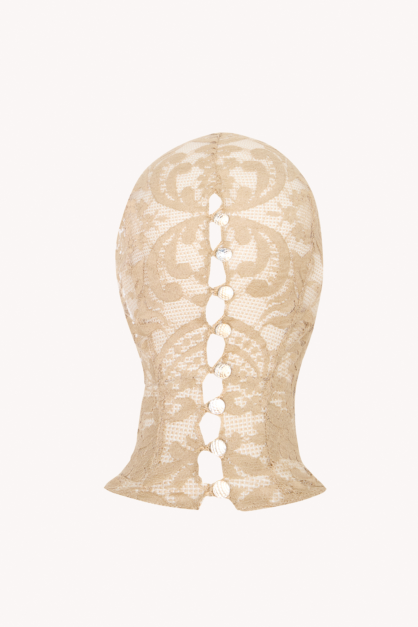 Face- covering headpiece crafted from delicate luxury nude lace. Complements the Aurora Lace Gown, adding a dramatic and mysterious touch.