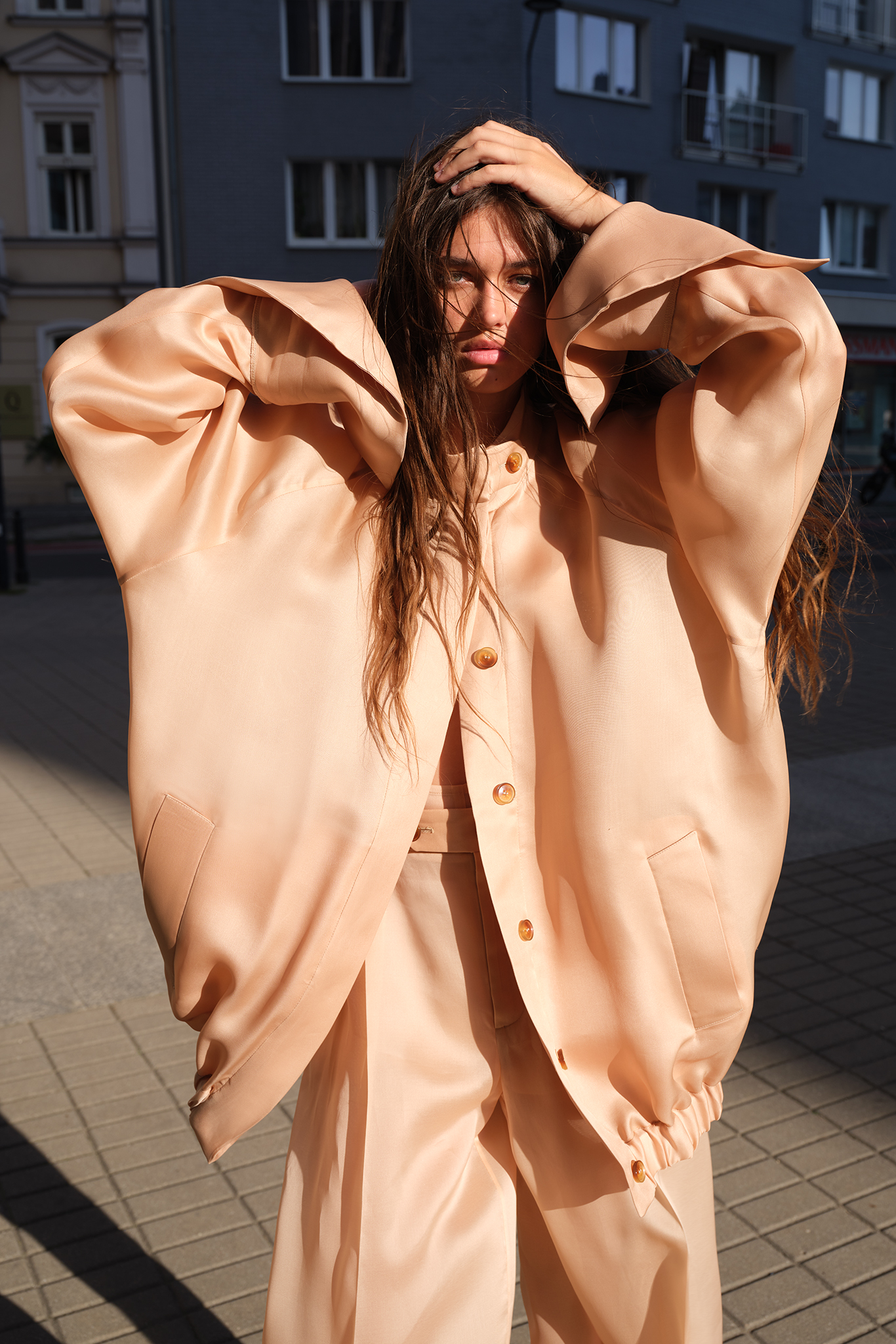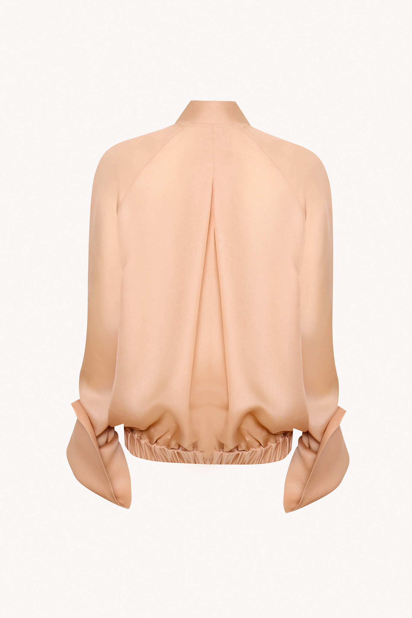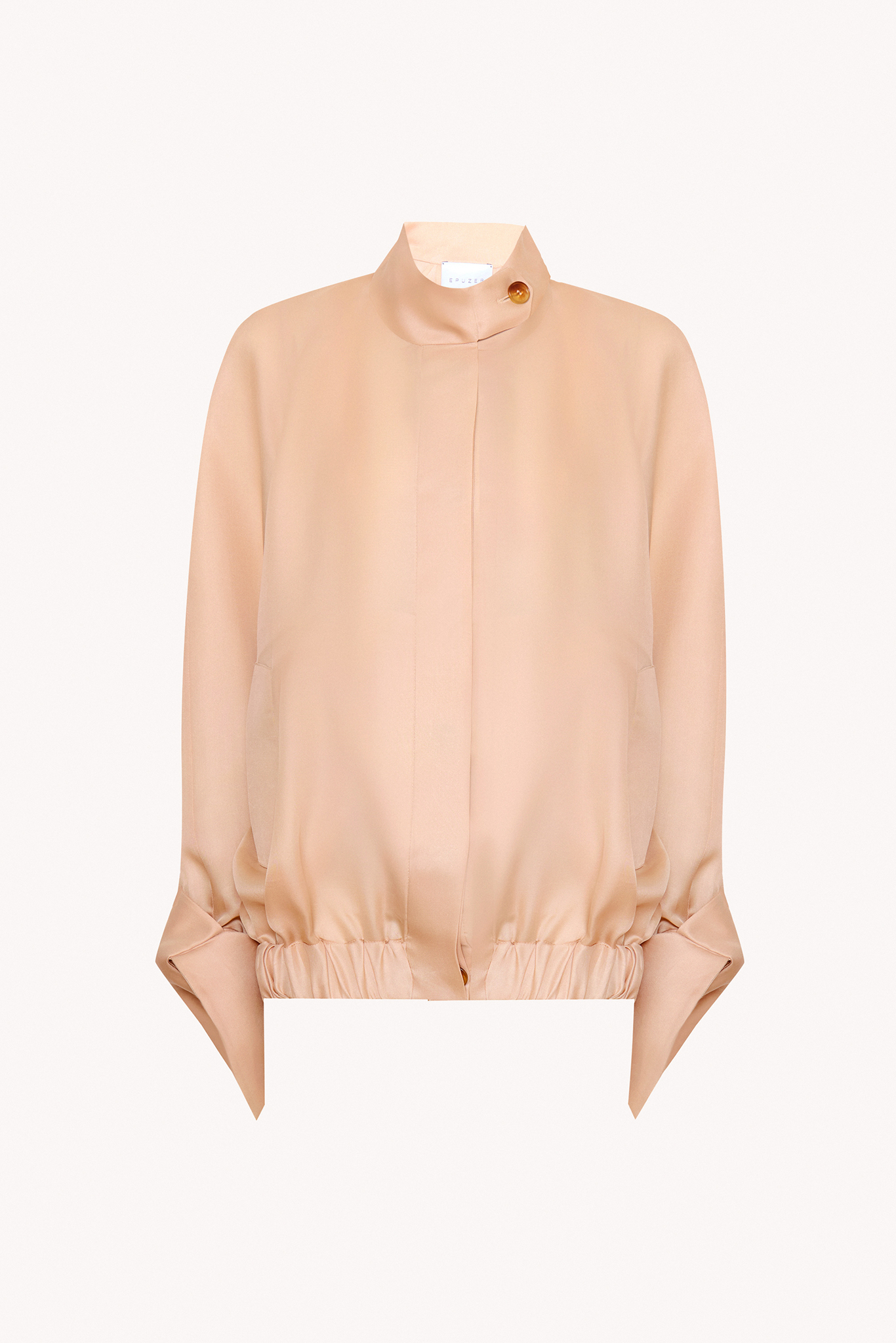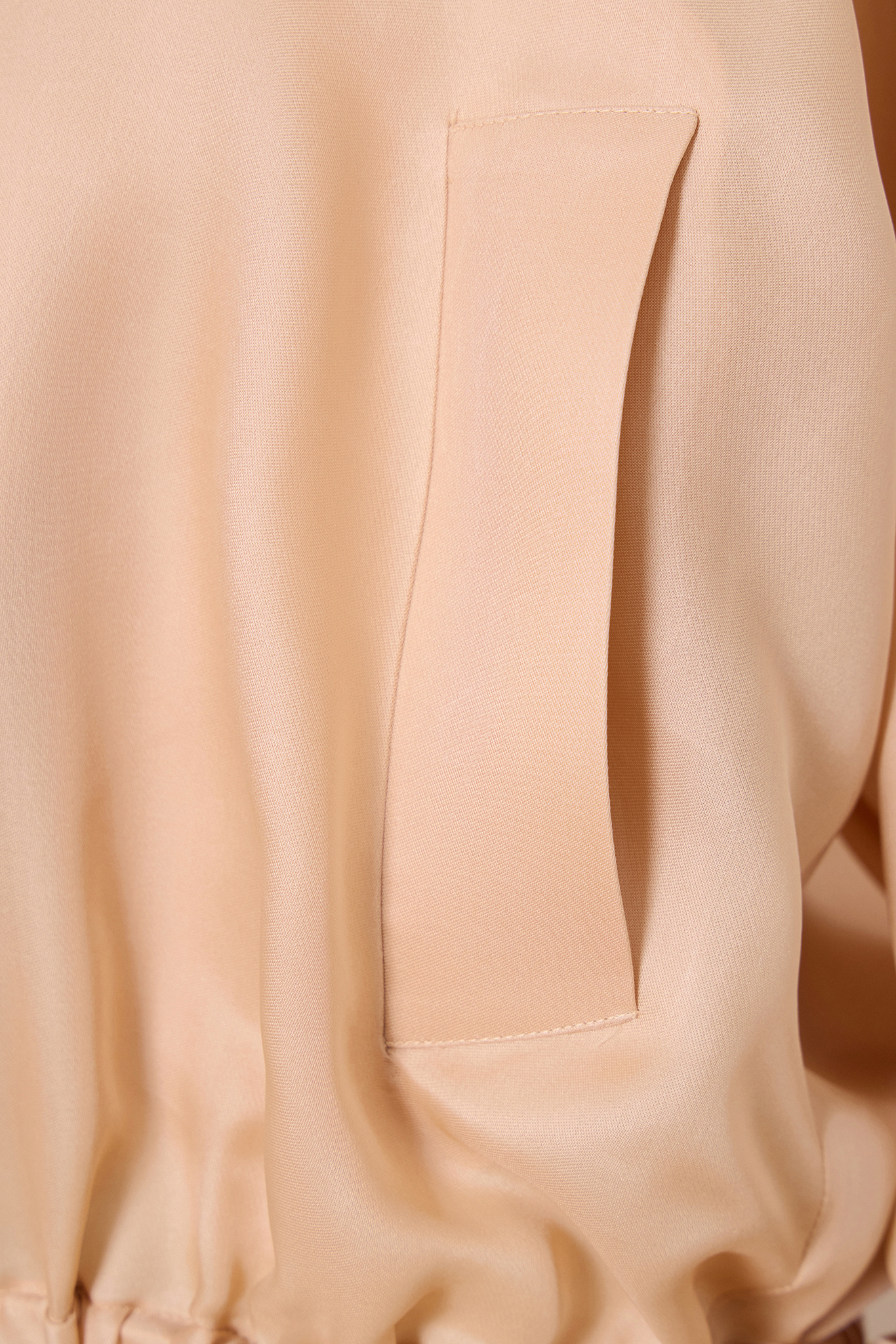 Kurtka bomber z transparentnej jedwabnej organzy w odcieniu nude. Lekka, półtransparentna forma z szerokimi rękawami, stójka i mankietami. Konstrukcyjne listwy i kieszenie podkreślają architektoniczny charakter modelu. Skompletuj swój look z transparentnymi spodniami z organzy.