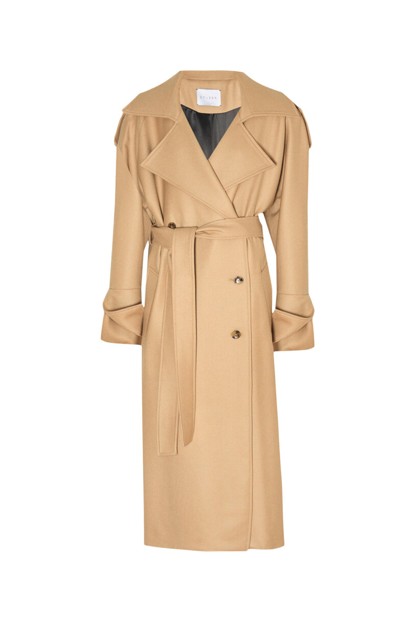 Statement long double- breasted wool coat with a belt and bold padded shoulders. Fully silk lined. A timeless piece infused with rock – edge sophistication- elegance with attitude.