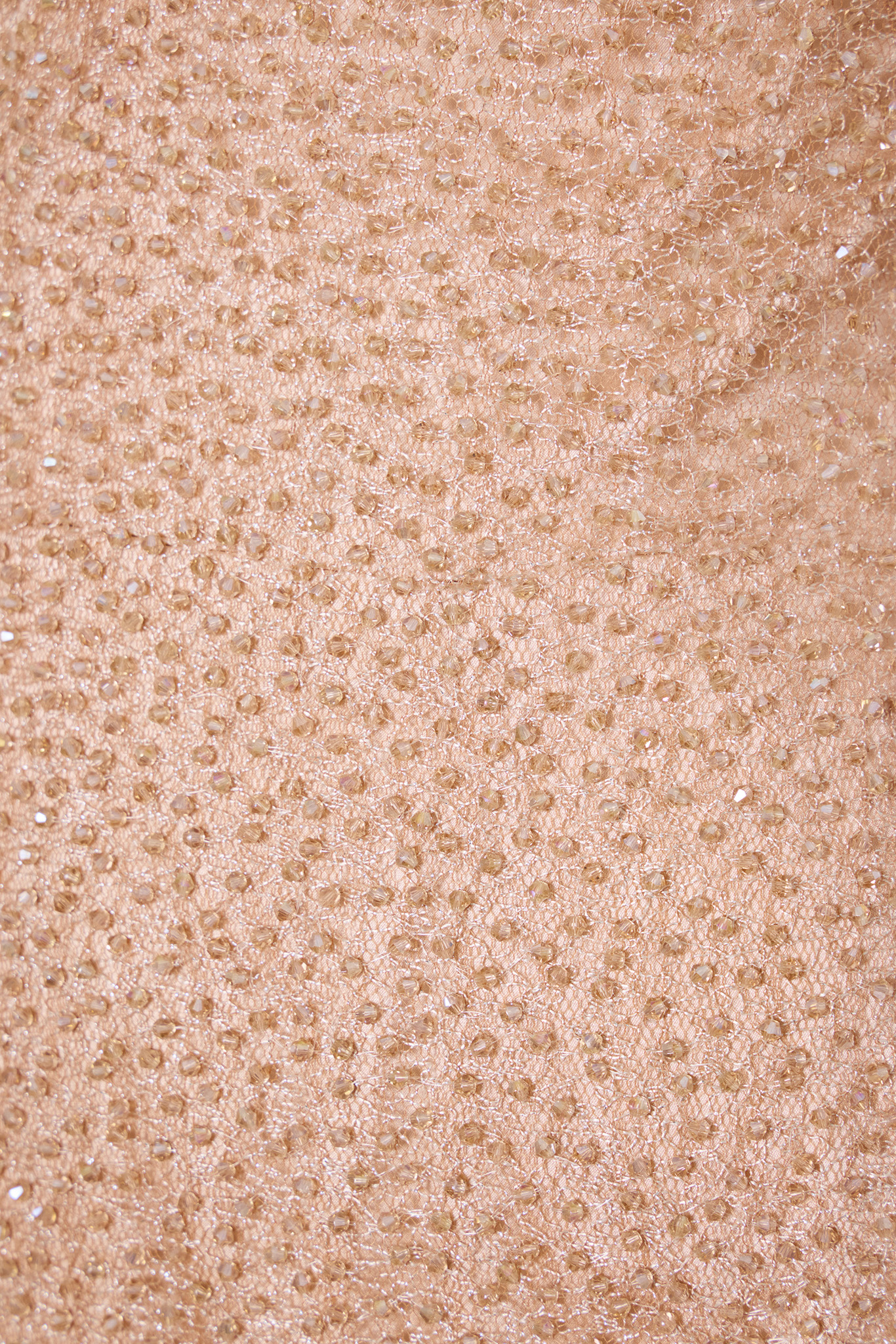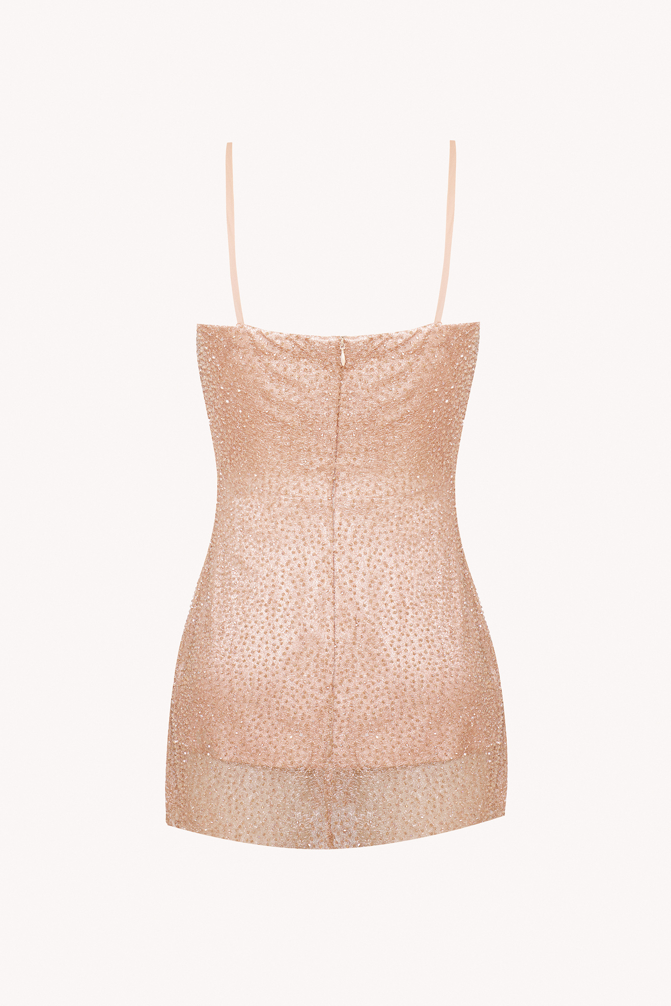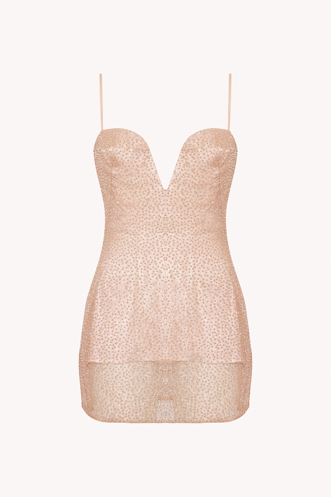Zjawiskowa sukienka mini z jedwabnym gorsetem, wykonana z transparentnej siateczki w kolorze cielistym zdobionej kryształkami tworzy look biżuteryjnego couture.