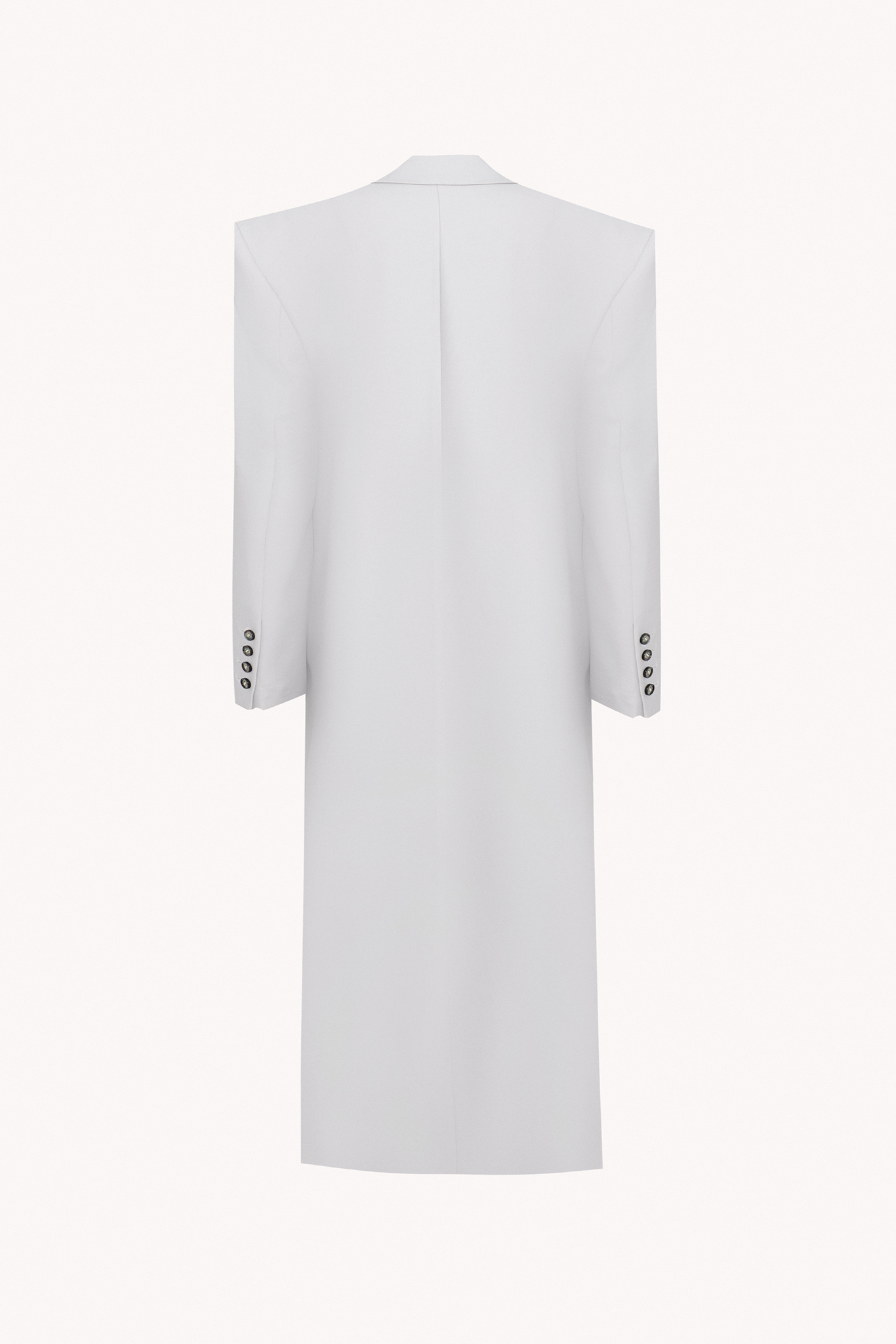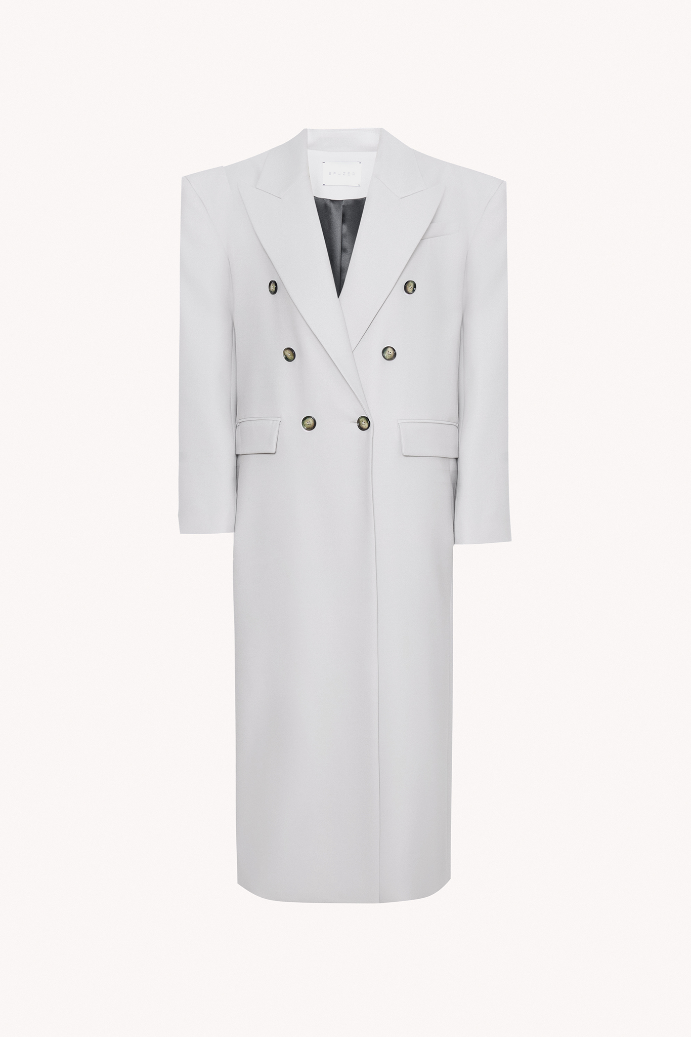 Long double-breasted oversize coat with broad shoulders and classic lapels. Crafted from luxury stone-toned wool, combining elegance with a modern edge.