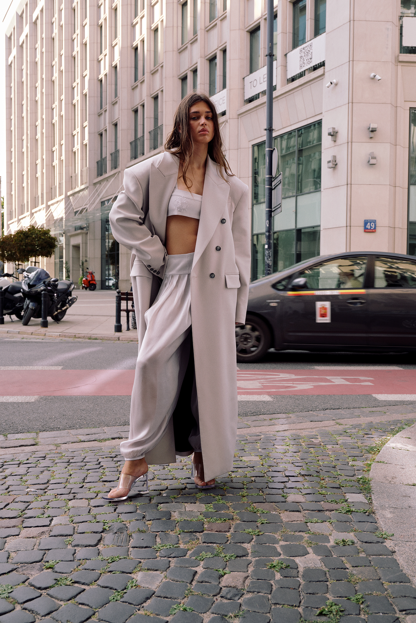 Długi płaszcz oversize o dwurzędowej konstrukcji z szerokimi ramionami i klasycznymi klapami. Uszyty z wełny w odcieniu kamiennym szarym,łączący elegancje z nowoczesnym charakterem.